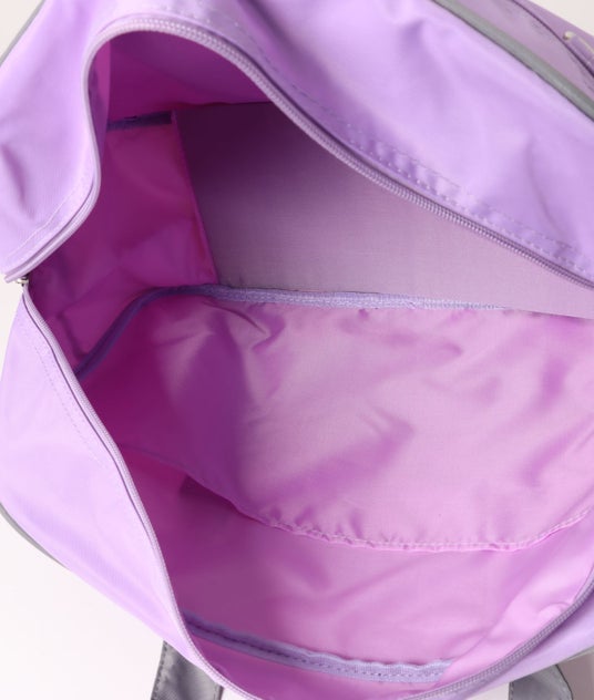 大容量サイズで機能性抜群!前面にファスナー付ポケットが付いた二層式で、内側には仕切りのついた多機能ポケット、ペットボトルポケットが付いて使いやすくなっています。A4サイズも収納でき、収納力抜群。前面と両サイドにDカンが付いているので、キーホルダーやぬいぐるみなどをたくさん付けて自分らしさを表現することができます。