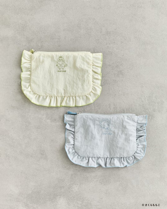 同系色の配色が魅力のフリルポーチ。お揃いデザインのパイピングトートと一緒に持ち歩くのも◎
