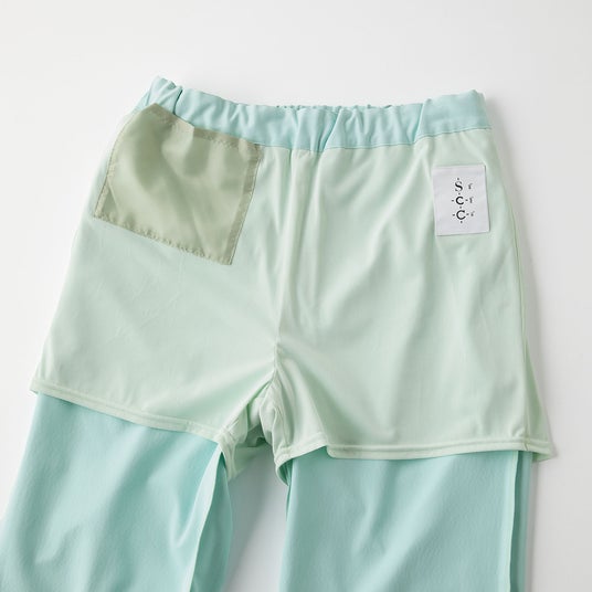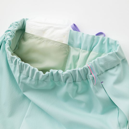 トップス同様、程よくリラックス感があり、ユニセックスに着用できるデザイン。生理の日にも安心して着用できるよう、横漏れを防ぐ裏地仕様で、腰元の内側と腰元横の内側には、それぞれナプキンやカイロを収納できる便利なポケットを備えています。