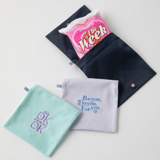 スクラブと同色のオリジナルポーチもセットでご用意。 トップスポケットの刺繍メッセージとリンクしたデザインで、日常をそっと支えるアイテムとしてご活用いただけます。