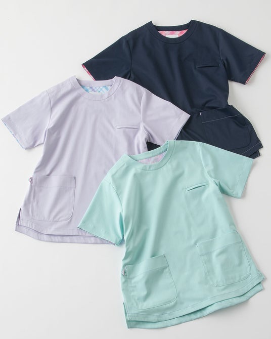 「Nice to meet me!」のテーマである“どんな瞬間も自分らしく”を体現するデザイン・カラーの全3種をラインアップ。なめらかで心地よい肌触りに加え、汗をかいてもサラサラ感を保つ吸水速乾性を備えた生地を採用。透けを防ぐフルダル糸を使用し、シワになりにくいノンアイロン仕様に仕上げています。さらに、水溶性の汚れが落ちやすい防汚加工も。着用するだけで気分を上げてくれそうなデザイン&こだわりのカラーリングと、医療現場で働く女性にうれしい高機能を兼ね備え、着心地の良さとパフォーマンス性も叶える3着です。