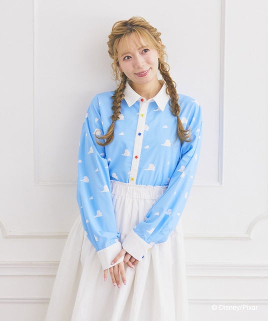 おもちゃの持ち主「アンディ」の部屋の壁紙をイメージしたシャツとワンピースは、爽やかなスカイブルーに雲を散りばめ、袖を通すたびに映画の世界観に浸れるようなデザインです。ユニセックス仕様のシャツと主役級の華やかなワンピースには、Areeamならではのボタンやリボンを施し、こだわりをぎゅっと詰め込みました。
