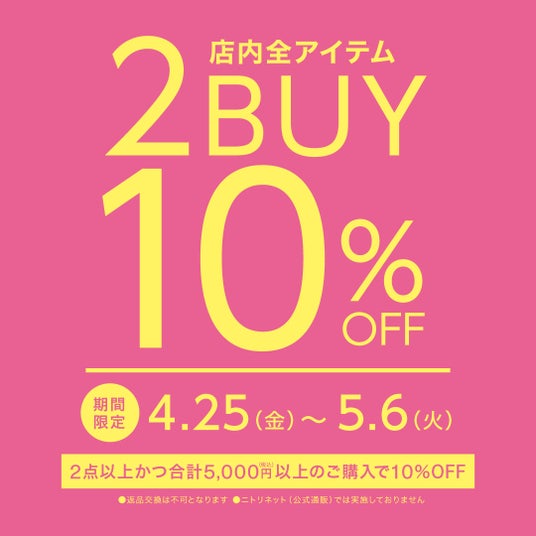 ニトリグループのアパレルブランド「N+」を展開する株式会社Nプラス(本社:東京都北区 代表取締役社長:高橋陵)は、N+全店(全国44店舗)を対象とした"2BUY 10%OFFキャンペーン" を開催いたします。2025年4月25日(金)~ 5月6日(火)期間限定の大変お得なキャンペーンです。