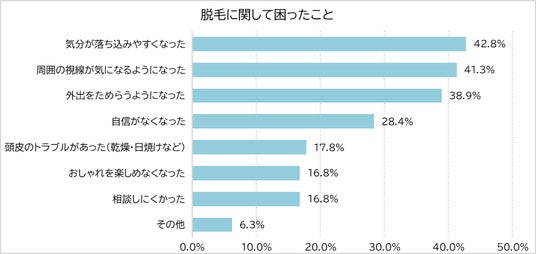脱毛に関して困ったことを尋ねたところ、最も多かったのは「気分が落ち込みやすくなった」(42.8%)でした。脱毛は外見の変化であると同時に、気分の落ち込みと直結しやすく、心理面に深い影響を与えているようです。