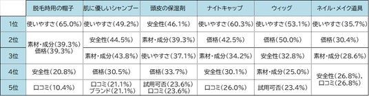 一方、「頭皮の保湿剤」、「肌に優しいシャンプー」では「安全性」や「素材・成分」への関心が高く、肌に塗布するアイテムに対しては、より慎重に選ぶ傾向も見受けられました。