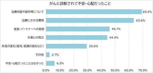 また「外見の変化(脱毛・肌質の変化など)」に不安を感じた人は29.6%と、約3人に1人でした。治療への不安に加えて、金銭面・外見変化での心理的な負担ものしかかっていたことが分かります。