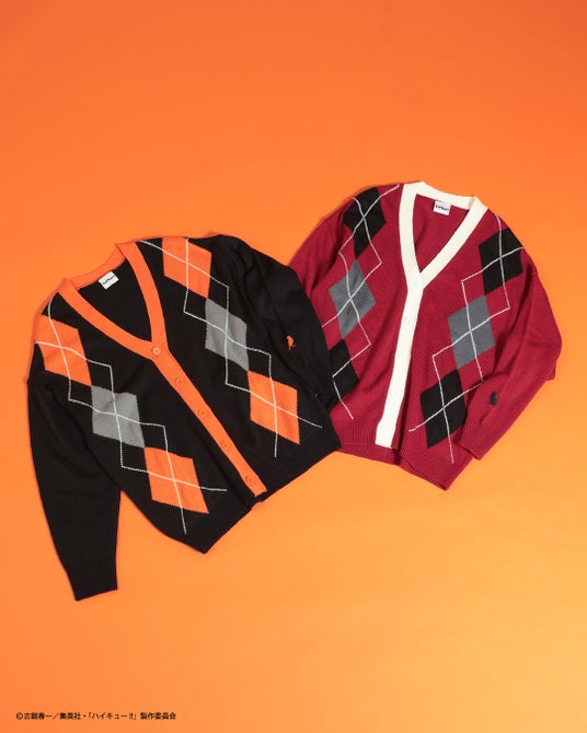 トップスでは、各高校のユニフォームをイメージした長袖Tシャツや、配色ラインとアーガイル柄が目を惹くカラーカーディガンなどの全9型をラインアップ。ラインカーディガンには、校章のモチーフを左胸にワンポイントで取り入れ、アーガイルカーディガンには、袖にカラスとネコのアートを刺繍しました。また、作中に登場する印象的なシーンをプリントしたトレーナーとモノクロTシャツもご用意しております。