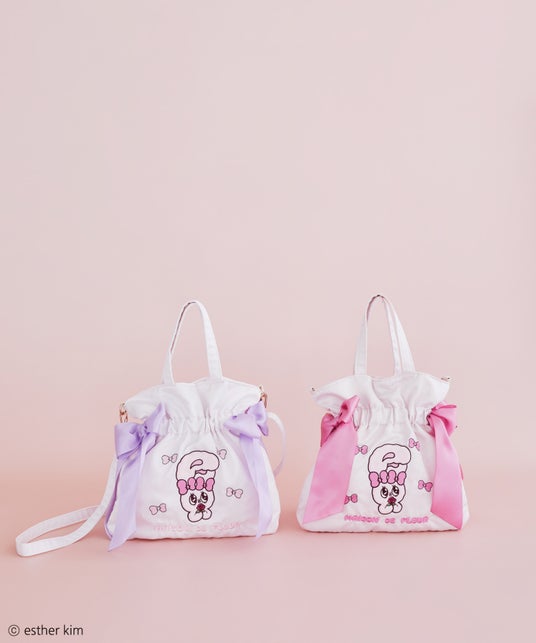大人気のダブルリボントートバッグには、同バッグを持ったリボンバニーをシルバーの箔プリントで表現。2Wayトートバッグとラウンドポーチには、リボンバニーをフロントに刺繍しました。ステッチには温かみのあるビターブラウンを使用し、柔らかく愛らしい雰囲気に仕上げました。また、Maison de FLEURのロゴには、「エスターバニー」限定のスペシャルデザインを採用しております。