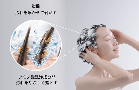 炭酸濃密泡が髪や頭皮とスタイリング剤の“間”に入り込み、蓄積した汚れを浮かせて落とします。アミノ酸系洗浄成分*¹がやさしく洗い流し、すっきりとした洗い上がりへ導きます。