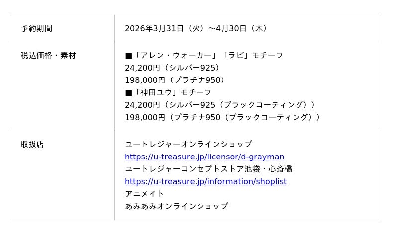 株式会社ユートレジャー(本社:東京都新宿区、代表取締役社長:青木 興一、株式会社ケイ・ウノの連結子会社)は、(原作:星野桂(集英社「ジャンプSQ.RISE」連載中))とのコラボレーションした「モチーフリング(指輪)」全3種類の予約受け付けを、2026年3月31日(火)~4月30日(木)の期間、ユートレジャーオンラインショップ、ユートレジャーコンセプトストア池袋・心斎橋にて行います。