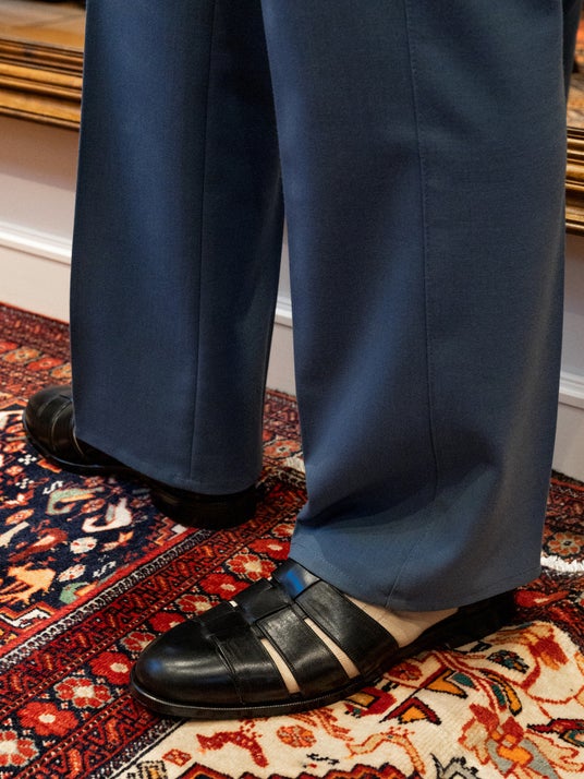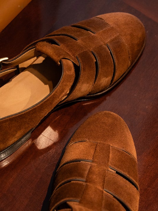 甲を覆うベルトアッパーで重視したのは、足が見えすぎないバランス。つま先側から段階的に開きの分量を調整することで指股を極力隠すことで、サンダルでありながら革靴のような気品ある表情を強めています。