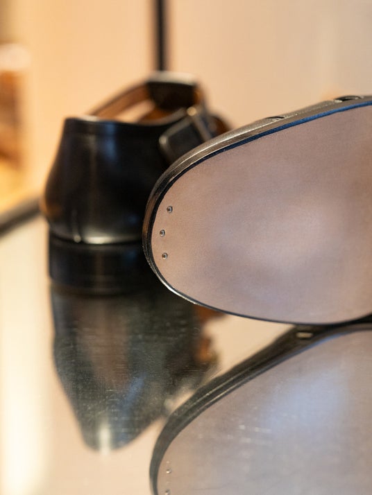 ベースとなる木型には起伏を抑えたナロートゥのドレスラストを採用し、外見の端正さだけでなく、革靴として自然なローリング歩行が可能となるよう、底面設計にも配慮しています。