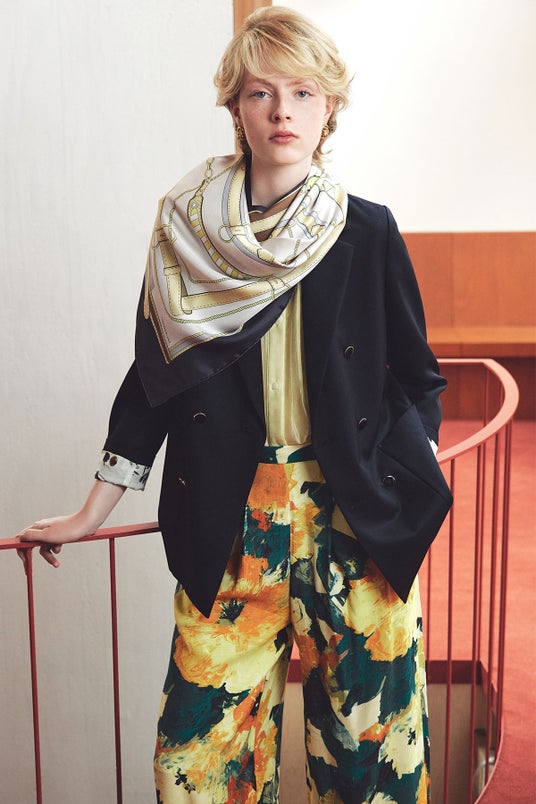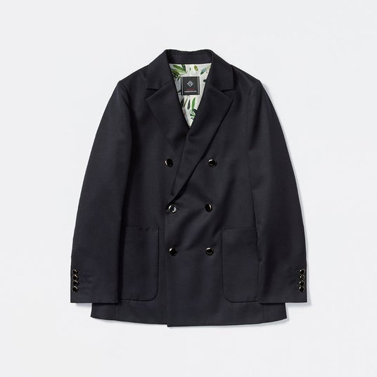 ダブルブレストの端正な顔立ちながら、柔らかな落ち感とパッチポケットが程よいリラックス感を演出します。袖を通すたび、裏地に配した繊細なアートプリントが心を充足させる一着。