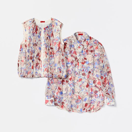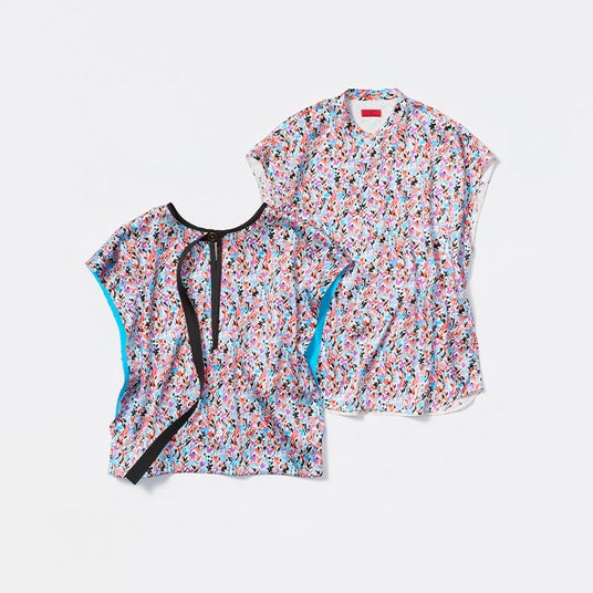 イタリアの老舗 LUIGIVERGA社製の特別なシルクブラウス。繊細な透け感と、軽やかで上品な揺らぎが魅力。手描きのフラワー柄が、不均一ゆえの柔らかな温もりを醸し出します。