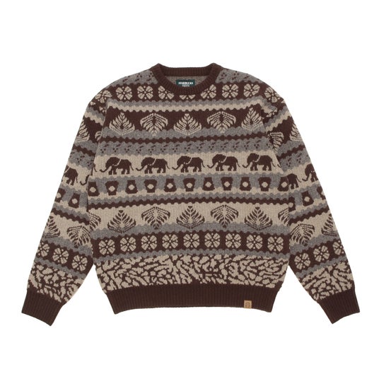 アフリカゾウやラテアート、スターバックスのカップやコーヒー豆を遊び心たっぷりに描いたオリジナルパターンを制作し、ジャカード編みで柄を際立たせた5ゲージのウール100%ニット。