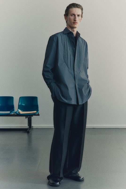 H&M Atelier Winter 2025: ルーズフィットタキシードシャツ¥9,999 ルーズフィットテーラードパンツ¥14,999 レザーミュール¥9,999