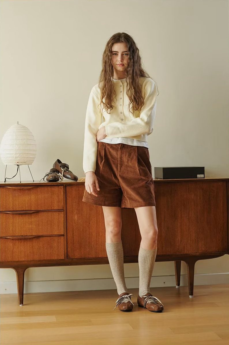 フラットシューズ/ショップ名:Kristin Companyハーフパンツ×ローファーで作る、レトロな80年代風プレッピーが今年らしい。ブラウン系でまとめて洗練されたこなれ感を演出。