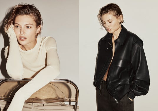 H&M Studio Essentials:<左>シルクブレンドトップス ¥7,999、<右>レザージャケット ¥49,999