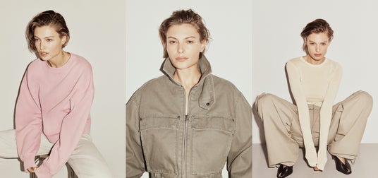 H&M Studio Essentials:<左>コットンスウェットシャツ ¥7,999、<中央>パッデッドキャンバスジャケット ¥16,999、<右>ピマコットントップス ¥3,999 コットンカーゴパンツ ¥9,999 レザーパンプス ¥16,999