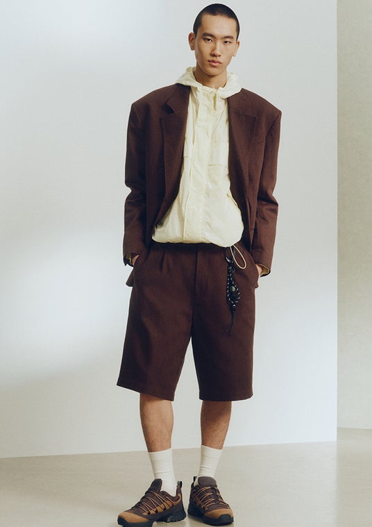 ボトムスはカーゴトラウザーズパンツや膝下丈のバミューダショーツなどを展開し、今シーズンのリラックスした雰囲気を際立たせます。トップスはノースリーブのニット、そして軽やかな質感のウィンドブレーカーをリラックス感あるブレザーの下に重ね着し、レイヤードを楽しみます。