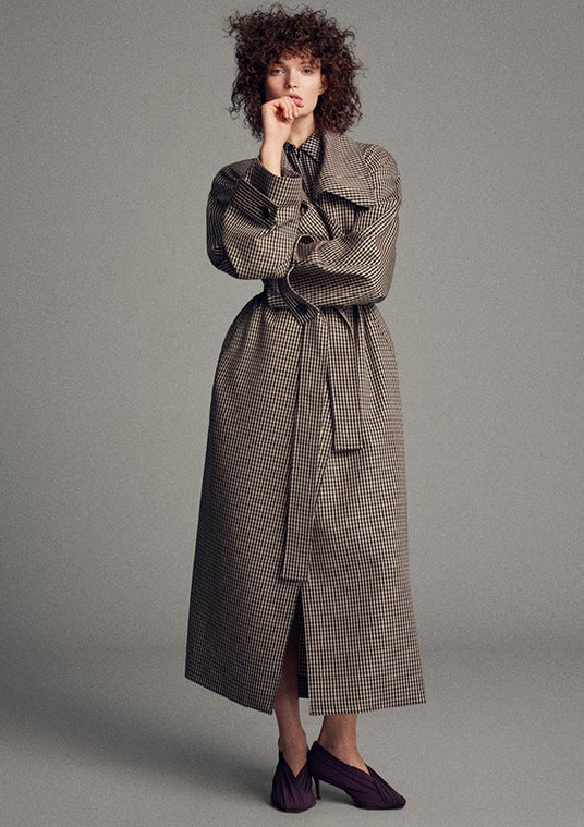 フロント部分はショート丈、袖周りはゆとりあるカーブデザインがポイントのビンテージライクなバーガンディーカラーのブルゾンや、深めのバックスリットでモードな印象を持ちつつ、バスローブのような着心地の良さが魅力的なクラシックなチェックのロングコートなどがメインのラインナップとして並びます。