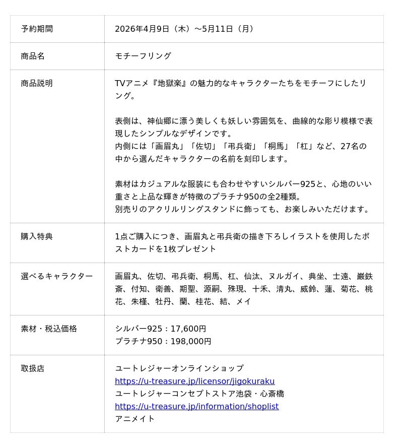 株式会社ユートレジャー(本社:東京都新宿区、代表取締役社長:青木 興一、株式会社ケイ・ウノの連結子会社)は、TVアニメ『地獄楽』とのコラボレーションアイテム「モチーフリング(指輪)」の予約受付を2026年4月9日(木)~5月11日(月)の期間、ユートレジャーオンラインショップ、ユートレジャーコンセプトストア池袋・心斎橋にて行います。ユートレジャーでは初めての取り扱いライセンスとなります。