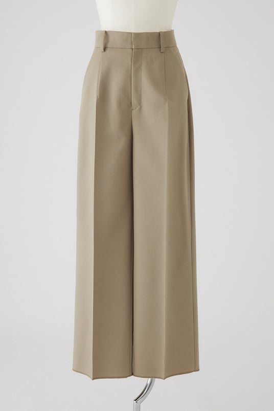 ジャケット同様に尾州を代表する老舗毛織屋のウールギャバジンを使用し、10年後も着ている自分を想像してもらえるようなベーシックなパンツを作りました。高密度ウールギャバの重厚感がマニッシュな雰囲気を与えてくれる為、あえて大きめのパッチポケットやシルクの裏地を用いる事で上品さとエッジを感じる一本に仕上げました。ウエストを直線シルエットにする事で女性特有の丸みを感じずストンとしたラインで着用いただける為、よりハンサムな印象を演出してくれます。