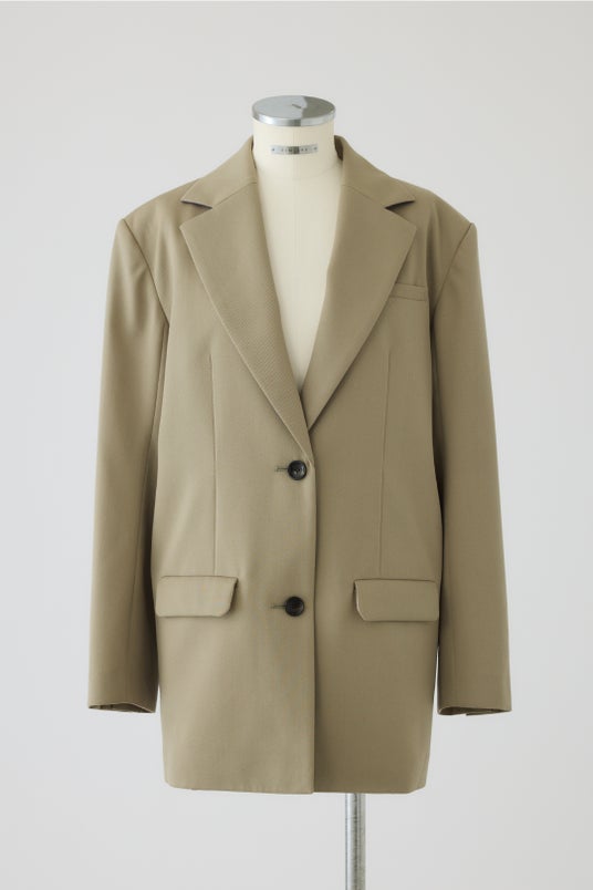 ニューヨーク、ヨーロッパといった海外ラグジュアリーブランドと長きにわたり取引きしている尾州を代表する老舗毛織屋のウールギャバジンを使用し、10年後も着ている自分を想像してもらえるようなベーシックなジャケットを作りました。高密度ウールギャバの重厚感に合わせたのは上品な艶と光沢が目をひくシルク裏地。着ている自分だけが高揚する事のできるスペシャルポイントです。オーバーサイズに見えて袖付けをスマートなサイズ感の立体シルエットにしている為、着用いただくと腕回りがすっきりと見えるようになっています。