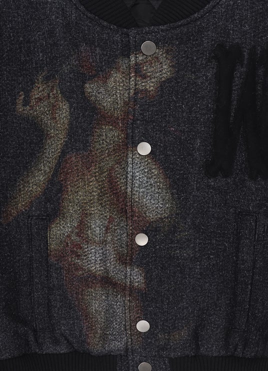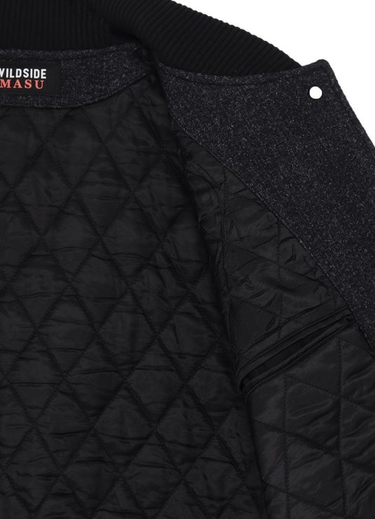 「WOMAN PORTRAIT VARSITY JACKET」は、同じくYohji Yamamoto POUR HOMME 2011A/Wコレクションに登場したコートから着想を得て、インパクトのある女性のグラフィックを前面にプリントしました。左胸にはM A S Uのイニシャル”M”を逆さにし、WILDSIDEのイニシャル“W”を特別に表現しています。プリント生地とメルトン生地をニードルパンチで融合させ、繊維の絡みから生まれる独特な立体感が特徴的で、重厚感とアート性のある表情が際立ち、一着で存在感を放ちます。
