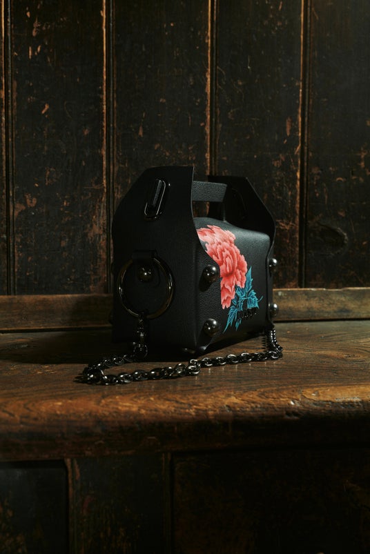 「FLOWER PRINTED LEATHER CAKE BAG」は、前回のコラボレーションで好評だったヨウジヤマモトのアイコニックな牡丹の花のグラフィックを、MASUのシグネチャーアイテムである”CAKE BAG”へ落とし込みました。手描きのような大きくプリントされた牡丹の花はインパクトを与え、金具をブラックニッケルに変更することでモードなデザインを融合させたアイテムです。