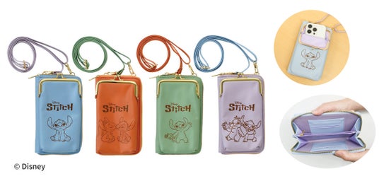「ディズニー スティッチ」となかまたちがデザインされたブルー、オレンジ、グリーン、パープルのスマホショルダー。表面ポケットはスマホの収納に便利。がま口式でスムーズに取り出せる。しっかり入るお財布機能付き。