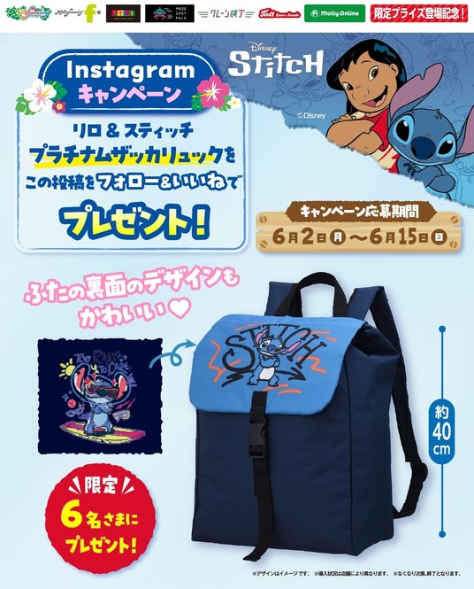 プライズゲーム用景品の展開を記念し、モーリーファンタジー公式X・Instagramでは「リロ&スティッチ プラチナムザッカリュック」が抽選で各6名さまに当たるSNSキャンペーンを開催いたします。