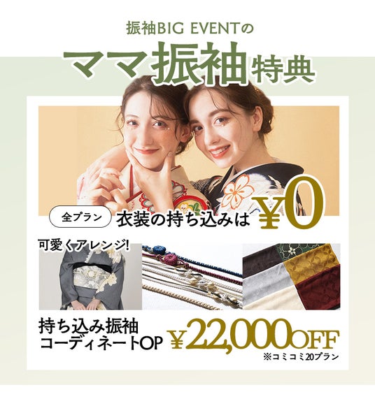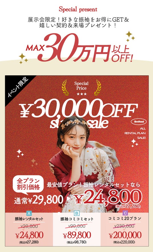 撮影+成人式当日の振袖レンタル+着付けが含まれたフルセットプラン「コミコミ20プラン」はなんと3万円引きに。