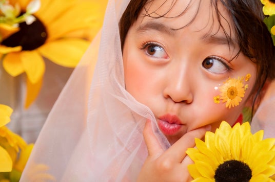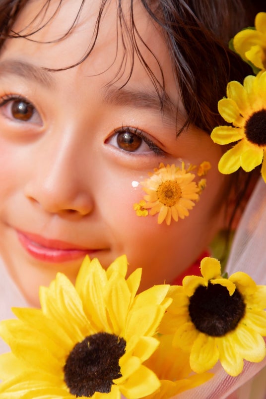 たくさんのひまわりに囲まれて、夏の太陽のように気いっぱいの笑顔が輝いています。