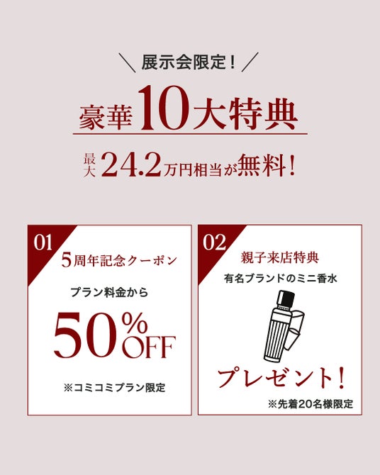 01)イベント契約でプラン料金が50%オフ(コミコミプラン対象) 親子来店特典02)人気ブランド香水を先着20名様にプレゼント