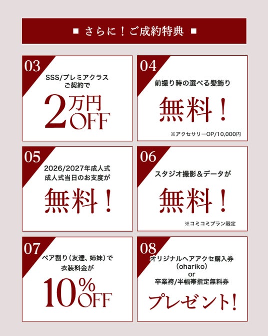 ご成約特典03)SSSクラス衣装、プレミアクラス衣装をご契約でさらに2万円オフに! 04)前撮り時の髪飾りがプレゼント(通常¥10,000→¥0に)05)2026年、2027年成人式当日のお支度が無料に! 06)スタジオでの前撮り&データお渡しが無料に! 07)ペア割で衣装料金がさらに10%オフに!(姉妹、ご友人とご利用くださいませ。 08)選べる特典も!aimmeオリジナルヘアアクセ購入券or卒業袴半幅帯指定料金