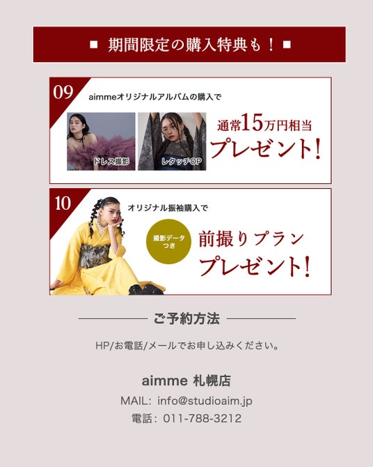09)aimmeオリジナルアルバムをご購入で選べる特典が!ドレス撮影1着無料orプレミアレタッチオプション 10)aimmeオリジナル振袖をご購入で前撮りプランプレゼント!