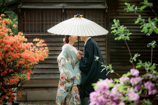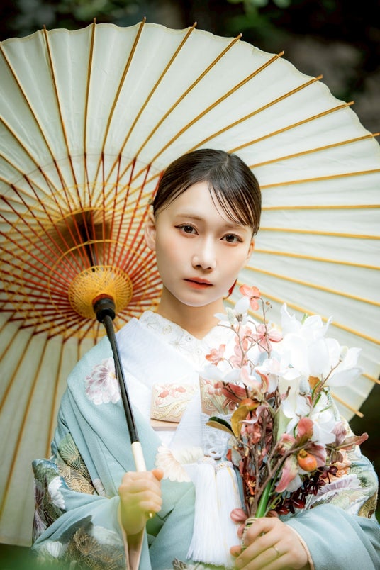 伝統と自然の光に包まれた、情緒あふれる美しさ。伝統的な日本の美しさと、生命力あふれる自然の中で、お二人の間に流れる穏やかで深い愛情が見事に表現されています。