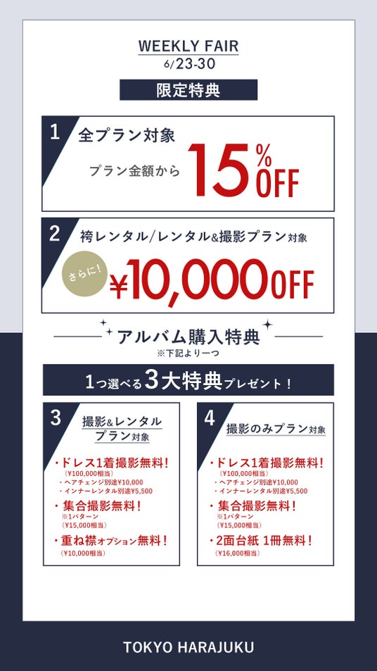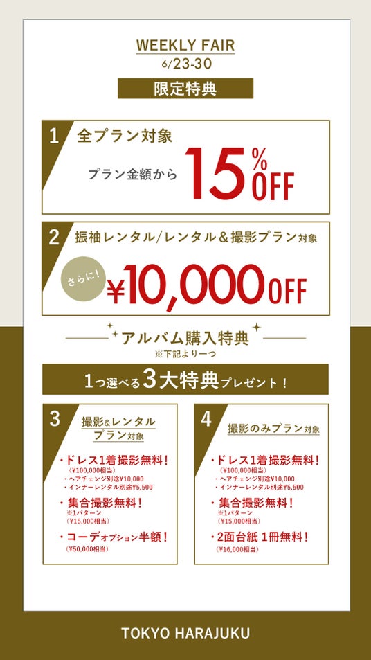 選べる3大特典:ドレス1着撮影無料、集合撮影料無料、重ね襟O無料