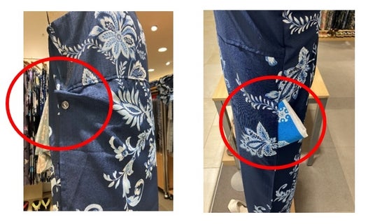 右:ワンピースには左右にポケット付き、ゆかたの状態でもポケットの出し入れが可能。左:脇のボタンで裾の位置を調整でき、「裾すぼまり」の着姿も実現。