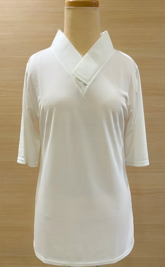 ポリエステル特殊糸を使用した接触涼感素材「クールセンサー(R)」により、吸汗速乾で涼感が得られるほか、透けにくいのも特徴です。ストレッチ素材で着脱も簡単です。本体に取り付けられた半衿には衿芯を差し込むことができ、面ファスナーにより衿合わせの角度を調整することができます。