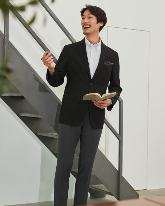 ジャケットは一般的な生地の約2倍の通気性に優れた素材を使用。動くたびに空気が流れ暑さを感じにくい構造に加え、ストレッチ性にも優れており着心地は抜群です。メッシュ生地の膝あてで通気性抜群のスラックスは、単品でもジャケットと合わせても使いやすい色柄を揃えています。ジャケットもスラックスも洗濯機洗いが可能で、汗をかいても清潔・快適に夏のジャケパンスタイルをお楽しみいただけます。