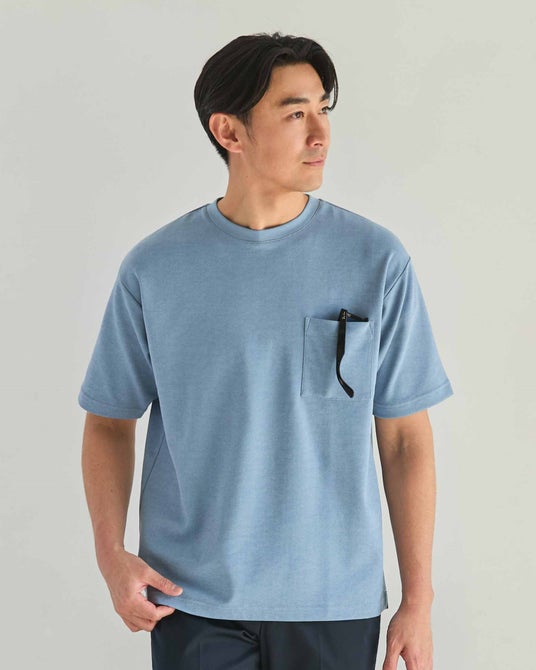 接触冷感・吸水速乾素材を使用しており、さらっとした着心地で夏でも涼しく快適に着用いただけます。ポケット付きで機能的に優れていることに加え、首にフィットするパターン設計のためTシャツでありながらもきちんと感を損なわず、シンプルなデザインでビジネスシーンでも活躍するアイテムです。