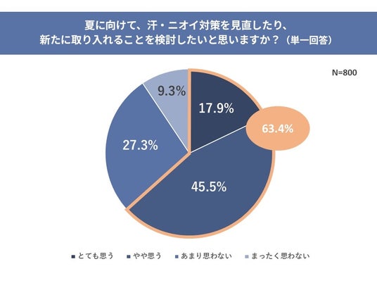 次に、現在行っている汗・ニオイ対策に満足しているかを聞いたところ、「あまり満足していない(39.5%)」「まったく満足していない(10.4%)」を合わせると49.9%の男性が満足していないことがわかりました。さらに、63.4%の男性が「対策の見直しや、新たな対策を検討したい」と回答しています。このうち、17.9%が「とても思う」、45.5%が「やや思う」という結果です。