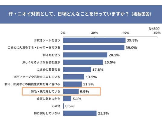 実際に行っている汗・ニオイ対策について聞いたところ、「汗拭きシートを使う」が最多の39.8%、次いで「こまめに入浴する・シャワーを浴びる」が39.0%となりました。一方、「除毛・脱毛」を実施している人は9.9%に留まり、まだまだ清潔に保つために体毛ケアも重要であることは浸透していないことがうかがえます。
