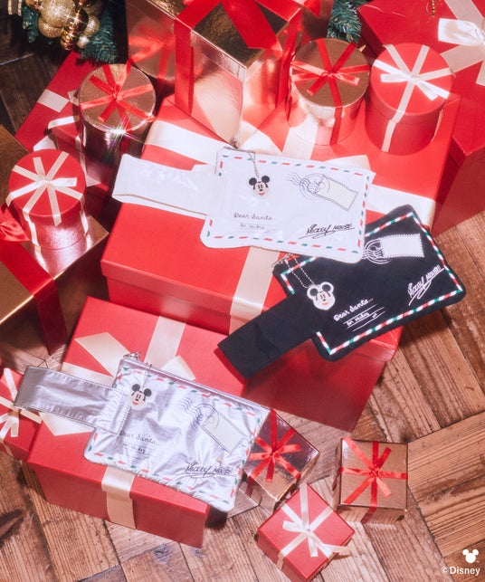 また雑貨では、日常に上品な可愛さを添えるアイテム全5型をご用意。「ミッキー&ミニー」のシルエットやリボン、ミラーを組み合わせた存在感のあるチャーム。クリスマスギフトのようなリボンがポイントの巾着型ポーチや、サンタクロースへの手紙をモチーフにしたポーチなど、この時期ならではの特別感が詰まったアイテムはプレゼントにもおすすめです。