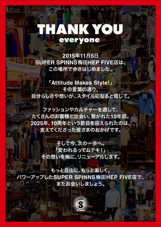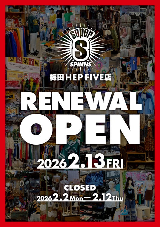 大阪最大級のSPINNSとして展開する「SUPER SPINNS梅田HEP FIVE店」(所在地:大阪府大阪市北区)は、2025年11月6日にオープン10周年を迎え、2026年2月13日(金)にリニューアルオープンいたします。