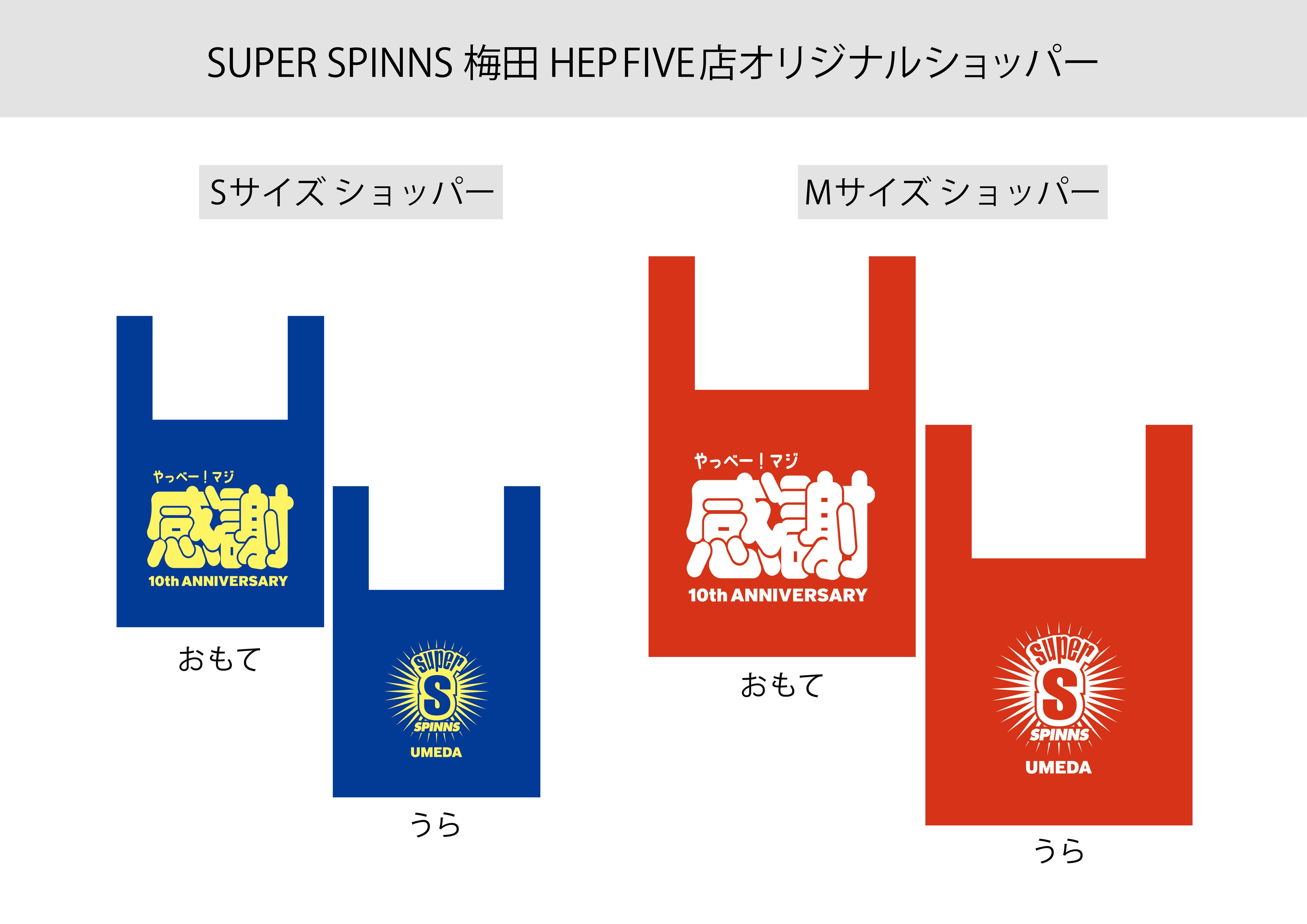また、リニューアルおよび10周年を記念し、SUPER SPINNS梅田HEP FIVE店限定のオリジナルショッパーが登場。10周年への感謝の気持ちを込め、「感謝」の文字を大胆にデザインしたビニール素材のショッパーを数量限定でご用意しております。