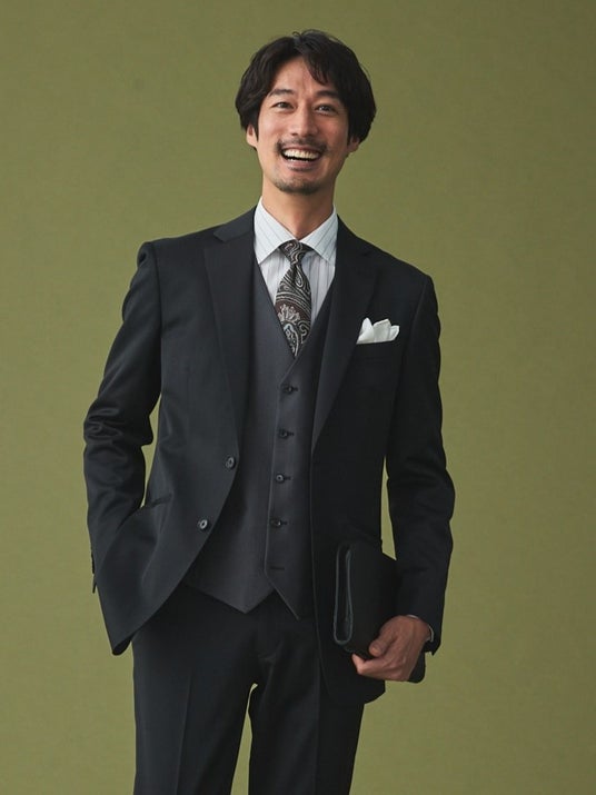ネイビースーツスタイルはブルーの千鳥柄ベストがポイント。柄物のベストには無地調のシンプルなシャツやネクタイがマッチします。王道のブラックスーツにはグレーのジレを合わせてドレッシーな装いを演出。ペイズリー柄のネクタイを合わせて、遊び心と品の良さを兼ね備えたコーディネートです。