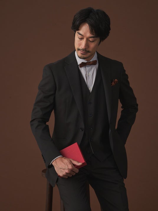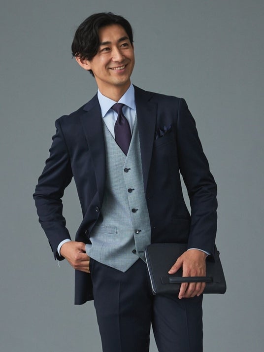 スーツは定番のネイビーやブラックに加え、深みと光沢のあるブラウンやカーキなど豊富なカラーバリエーションを揃えております。ベストはネイビー、ブラウン、カーキから2色を組み合わせたリバーシブル仕様で、シャツやネクタイとの組み合わせにより多彩なスタイリングをお楽しみいただけます。